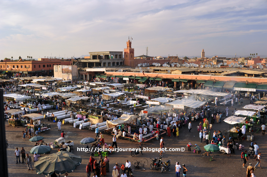 Zum Sonnenuntergang ändert sich das Bild auf dem Platz. Die Hektik nimmt zu und es werden von überall her Verkaufsstände herangefahren, Gaukler betreten die "Bühne", Schlangenbeschwörer holen ihre Reptilien aus den Körben und es wird vor allem lauter. Dies ist ein Zeichen um sich eine gute Aussichtsposition zu suchen, die es in den Cafés um den Platz gibt. Das wissen natürlich viele andere auch und so muß man schauen, dass man einen guten Platz erwischt, denn zum fotografieren will man natürlich nicht in zweiter Reihe sitzen. Es gibt diverse Cafés. Das bekannteste dürfte das Café de France sein, das aber unseres Erachtens nicht wirklich die beste Aussicht bietet. Unsere Wahl fiel auf das Cafe Glacier, von dessen Dachterasse man nicht nur Gegenlicht hat sondern auch prima sehen kann wie die Schatten auf dem Platz länger werden. Von oben zu fotografieren hat auch den Vorteil, dass man nicht für jedes Bild zur Kasse gebeten wird. Denn die "ach so lustigen Gaukler" und Schlangenbeschwörer können ganz schön unfreundlich werden wenn man nicht für Bilder bezahlt, die man von ihnen macht. Von oben konnten wir erkennen, dass immer mehrere Jungs zusammen arbeiteten und sich gegenseitig darauf aufmerksam machten wenn mal jemand ein Bild des Kollegen schoß.